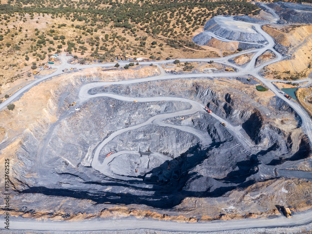 Aerial view of an open-cast slate quarry with heavy machinery.