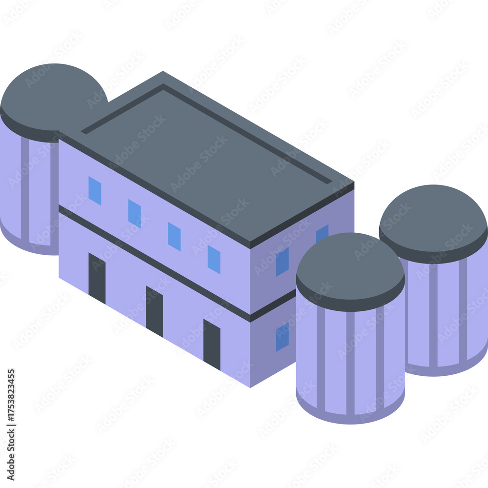 Isometric Nuclear Power Plant Building with Cooling Towers on Transparent Background in a Clean Minimalist Style