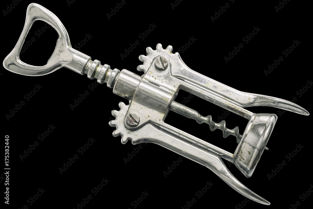 Old Worn Chrome Plated Wing Corkscrew Isolated On Black Background
