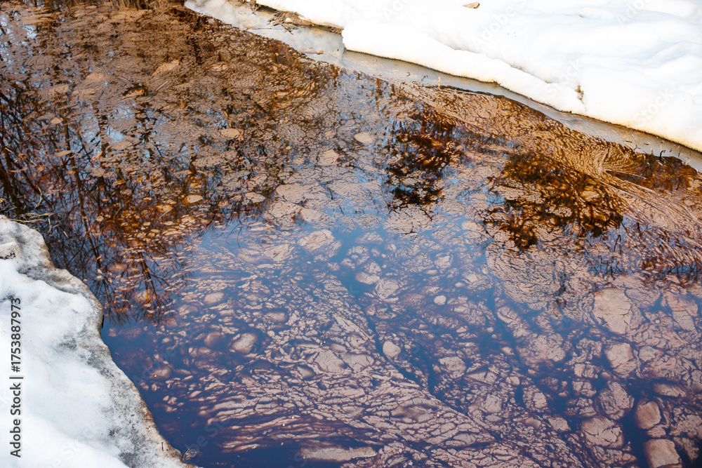 A film of fuel and oil, floating in a frozen river, pollution from nasty chemicals