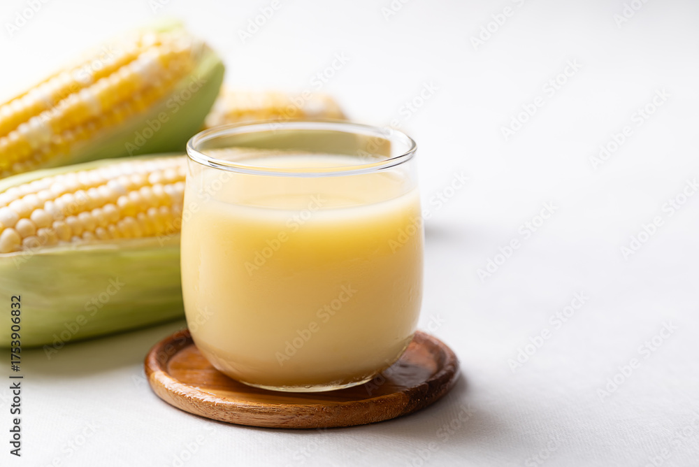 Sweetcorn milk in glass and fresh sweetcorn on white background, Alternative milk from plant, dairy free
