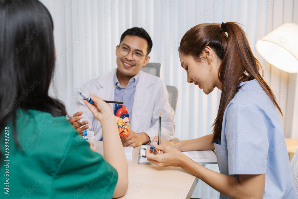 Group of doctors and nurses consulting about a complex patient case in hospital office. Team analyzing medical data and discussing diagnostic plans for accurate and efficient treatment.