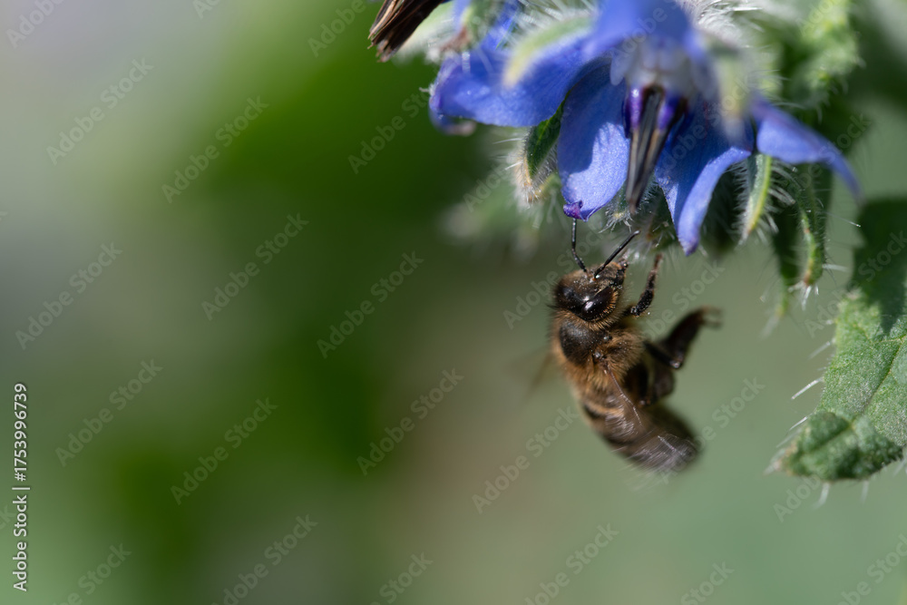 Close-up of a honeybee flying around a blue borage plant (Borago officinalis) in search of pollen. There is space for text in the background.
