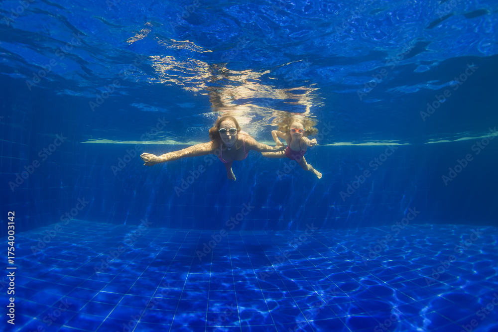 Happy family - mother, baby girl in goggles swim, dive in pool with fun - jump deep down underwater. Healthy lifestyle, people water sport activity, swimming lessons on holidays with kids