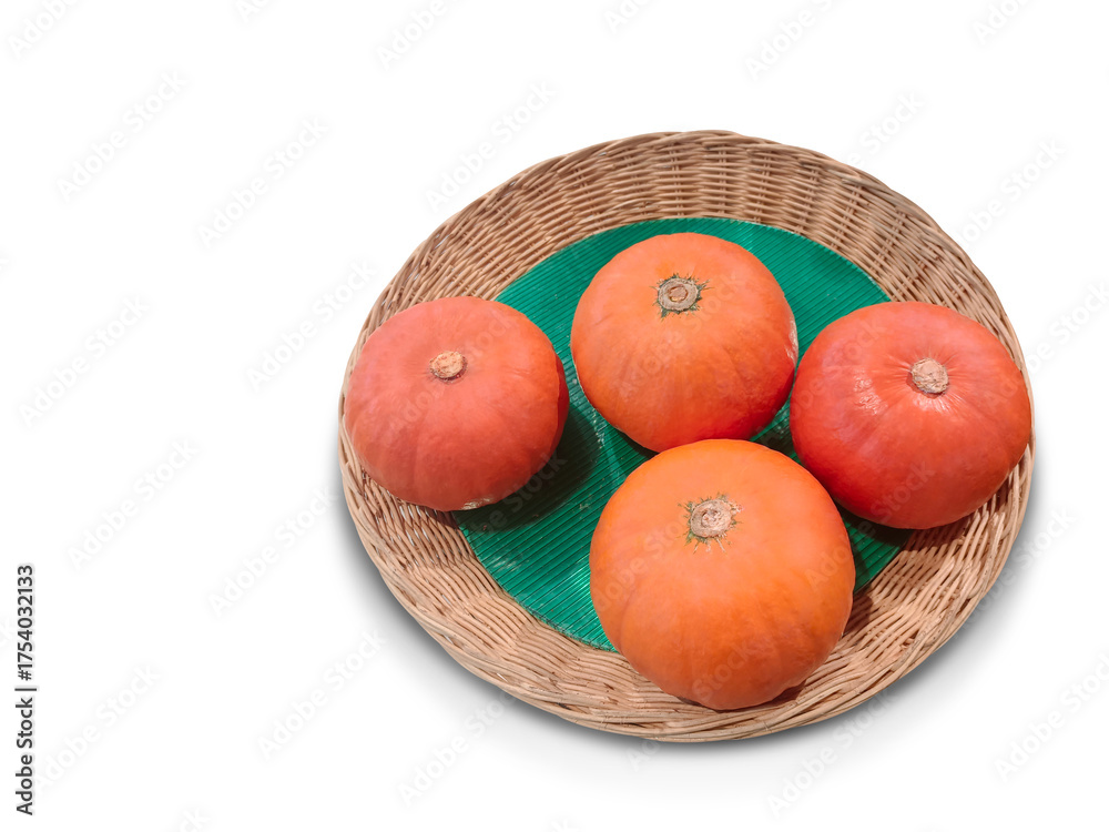 top view four pumpkins placed on green banana leaves in a basket on a white background, food, fresh, vegetable, nature, copy space