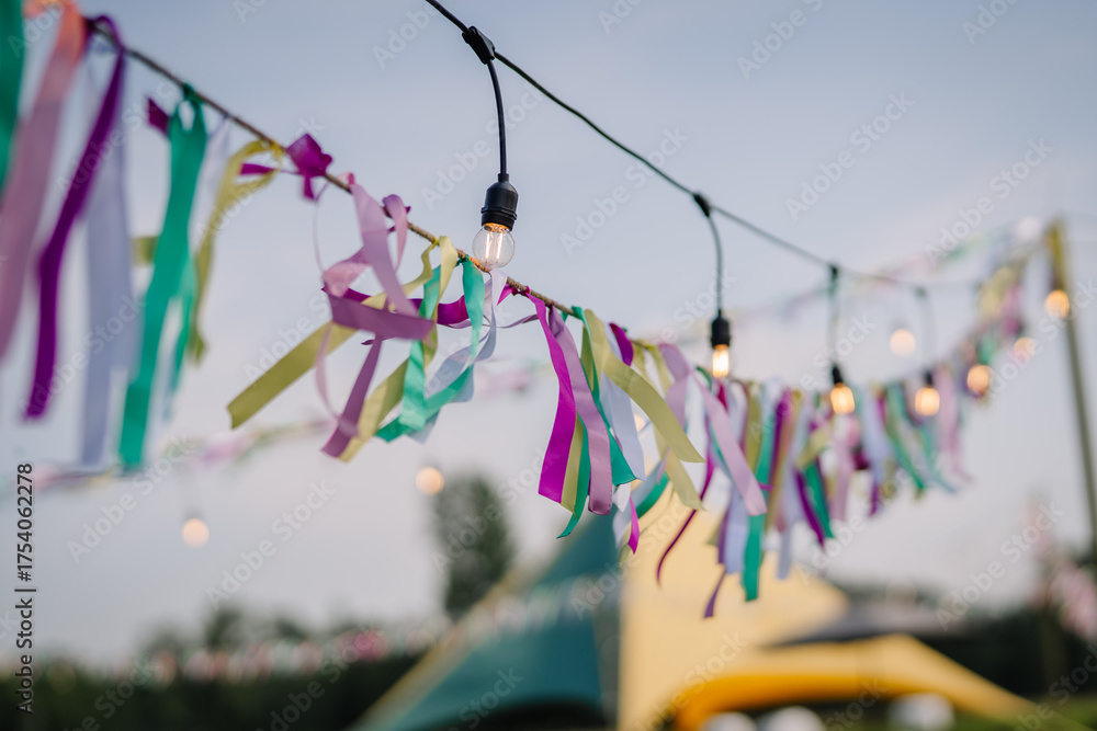 Colorful ribbons and string lights hang at a hippie festival, creating a festive, whimsical atmosphere under the open sky during a warm summer evening.