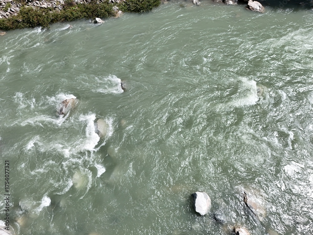The water is green and has rocks in it. The rocks are scattered throughout the water. The water is moving and has a strong current