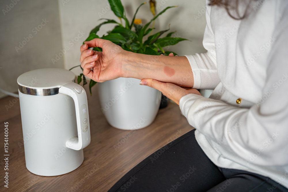 Scald burn on a hand caused by steam from a kettle in a kitchen. Domestic accident illustrating the danger of hot appliances.