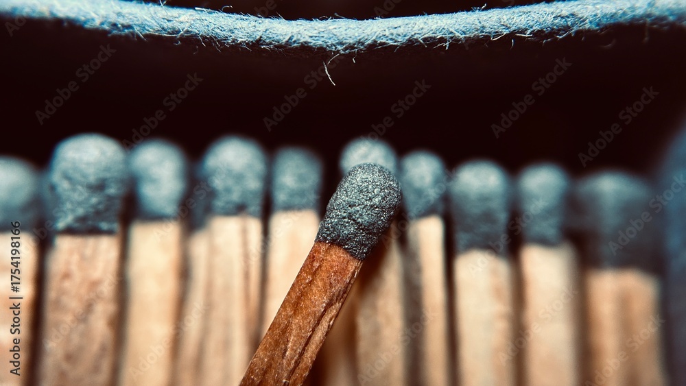 A macro image showing a row of matchsticks inside a matchbox, with one match slightly leaning forward. The blue match heads and the textured box edge create a striking, detailed composition.