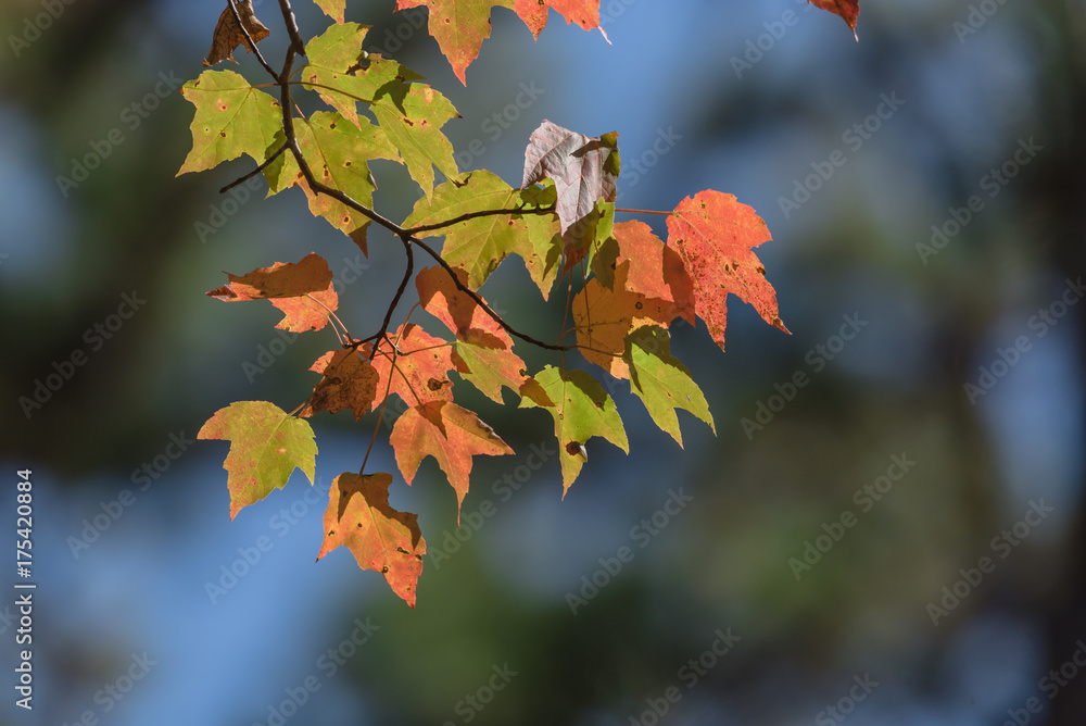 Close-up vibrant leaves changing color during fall season in Mesa, Arkansas, USA. Natural backlit light, soft and selective focus with bokeh. Colorful autumn foliage again dark background.