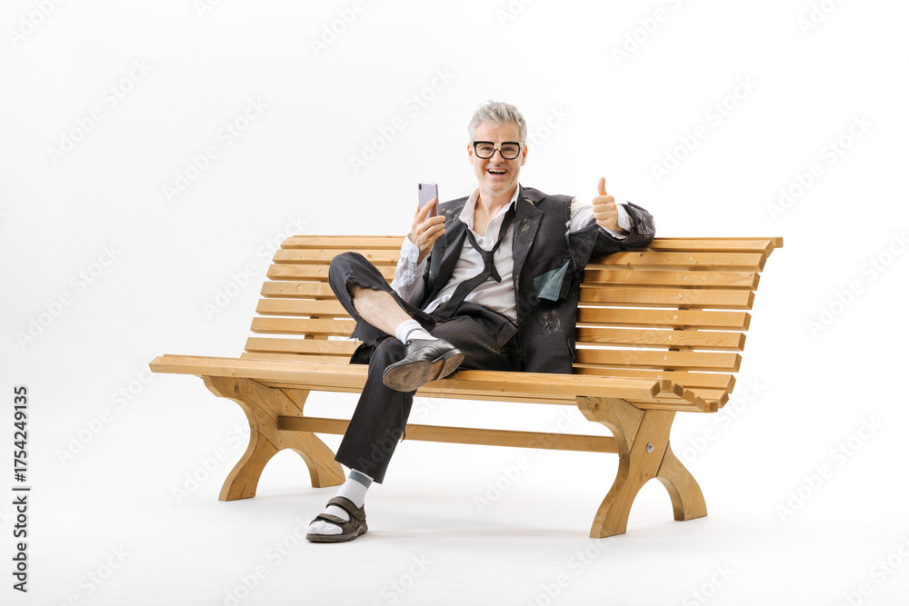 Happy homeless unemployed businessman using a job search app