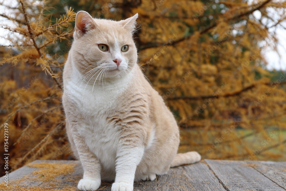 A ginger cat is sitting on a wooden table among fallen needles in front of an autumn larch tree.