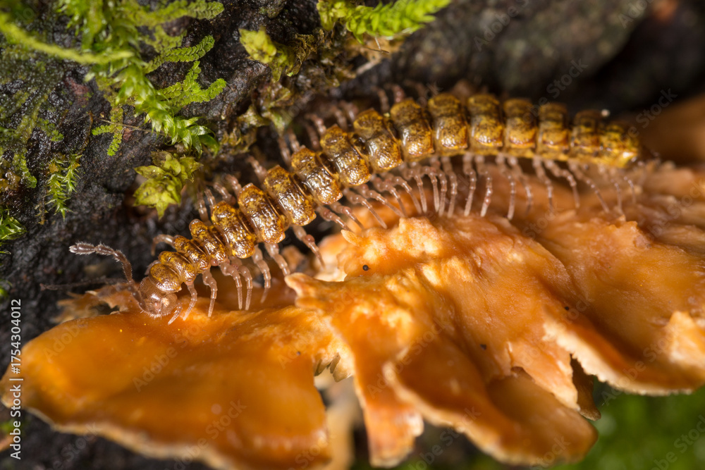 Close up of a native new zealand centipede on a mossy log