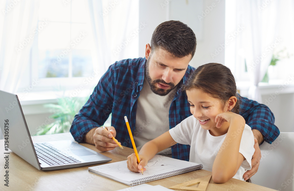 Father and daughter learning homework together. Dad guides a smiling child at a desk, with laptop and notebook, explaining tasks and building education. Concept: family learning and education.
