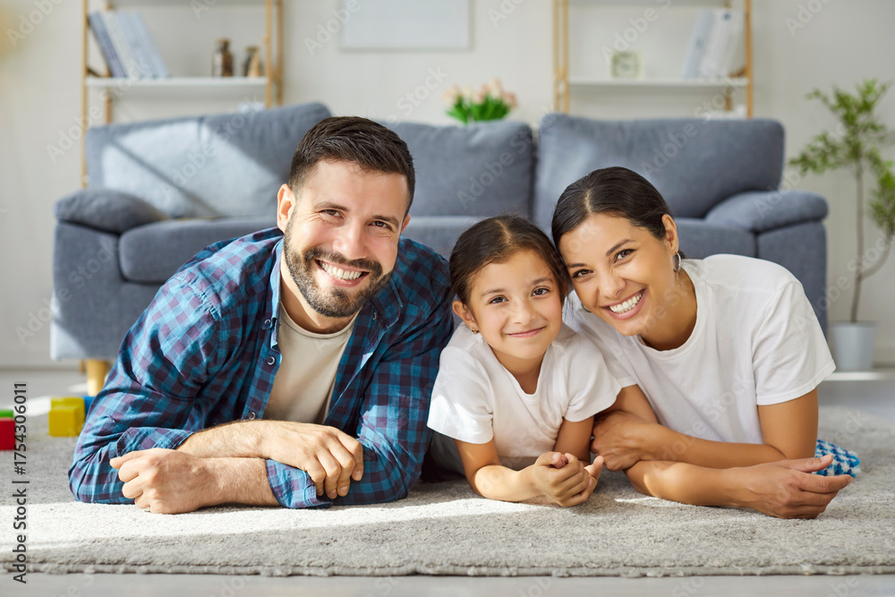 Happy family parents and child smiling together. They lie on a soft carpet, relaxing and bonding in the living room, enjoying playful moments and cozy warmth. Home love and happiness concept.