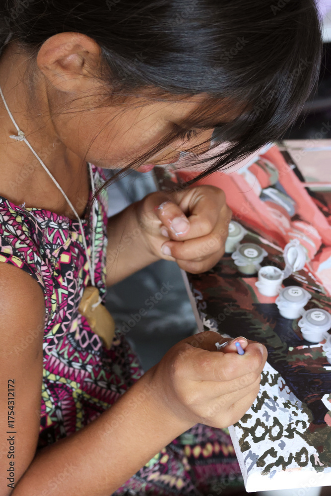 A girl paints a picture using paints and a brush. Paint by numbers. A fragment of the canvas and paint containers are visible. Oblique Angle.