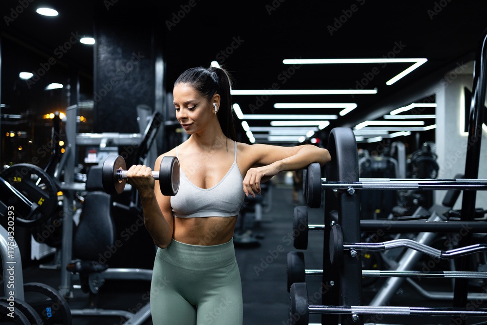 Motivated professional athlete exercising with dumbbell weights in the gym.