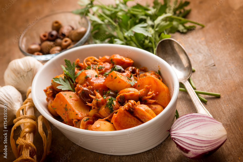 squid with tomato sauce olives and potatoes