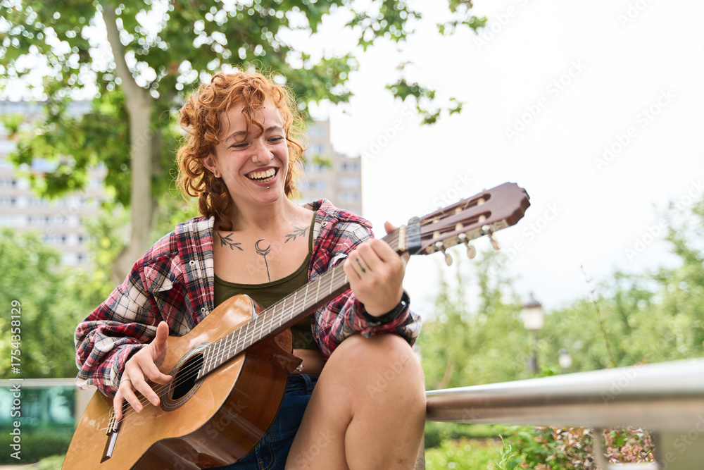 Young redhead woman playing acoustic guitar outdoors and smiling
