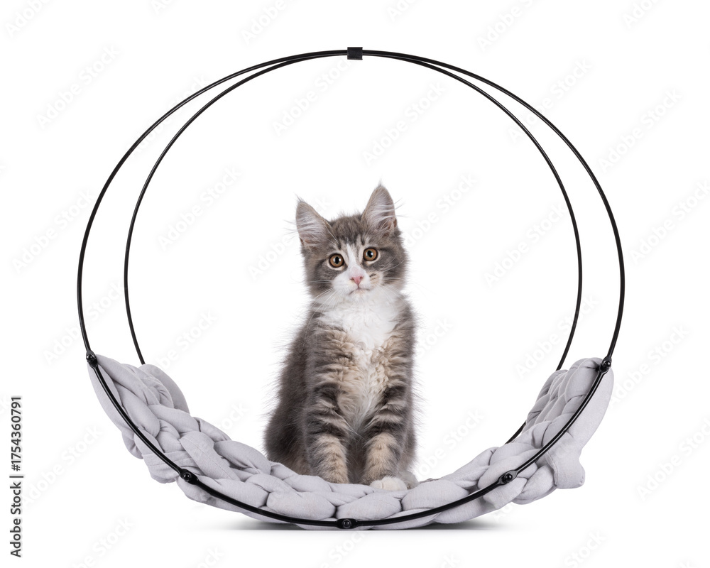 Maine Coon polydactyl cat kitten sitting up in round metal basket. Looking straight to camera. Isolated on a white background