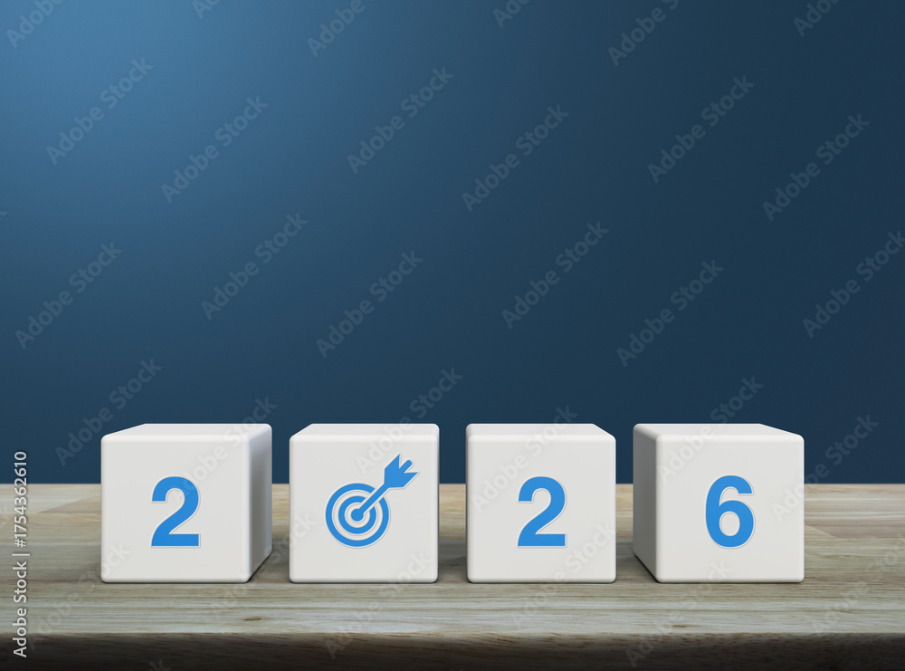 2026 letter with goal icon on white block cubes on wooden table over light blue wall, Happy new year 2026 success concept