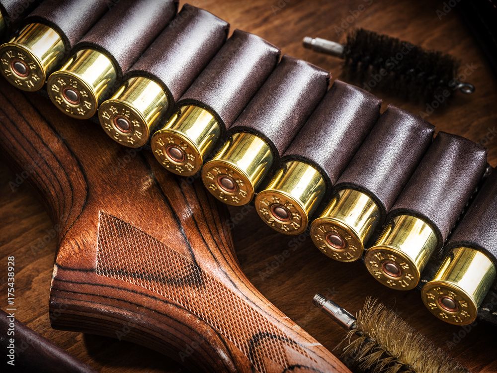 Pump action shotgun, 12 guage cartridge and hunting knife.