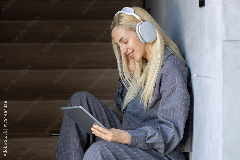 A smiling young woman sits on modern stairs, enjoying music through her headphones while interacting with her tablet