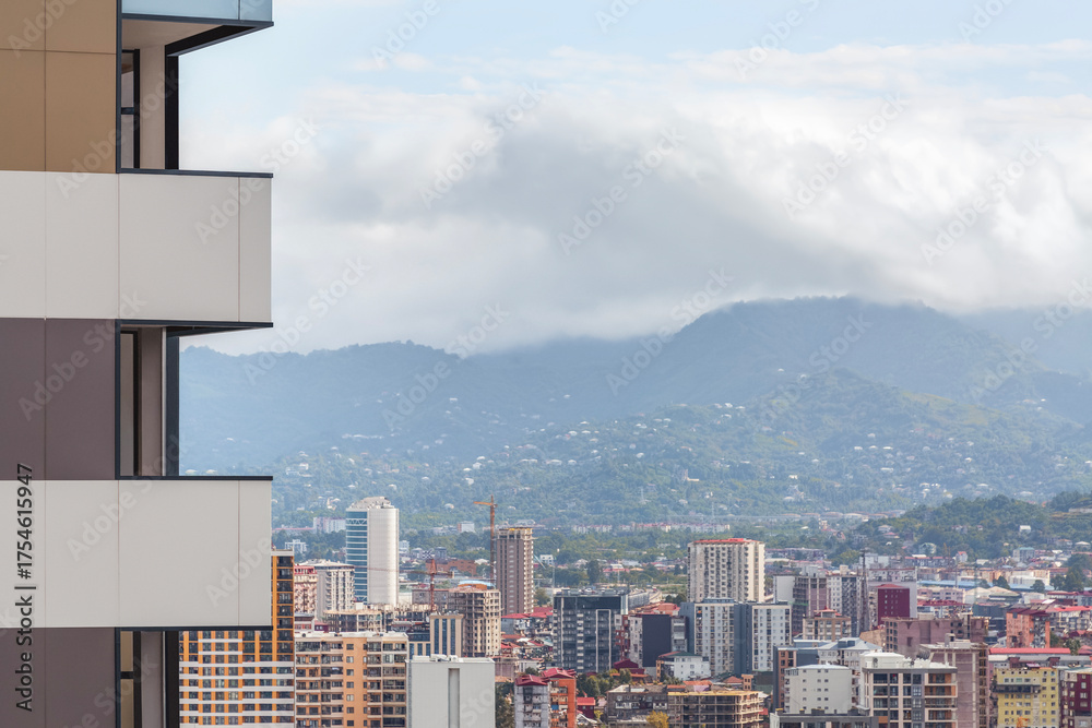 View of the balconies of a modern skyscraper against the backdrop of the city and mountains. Copy space
