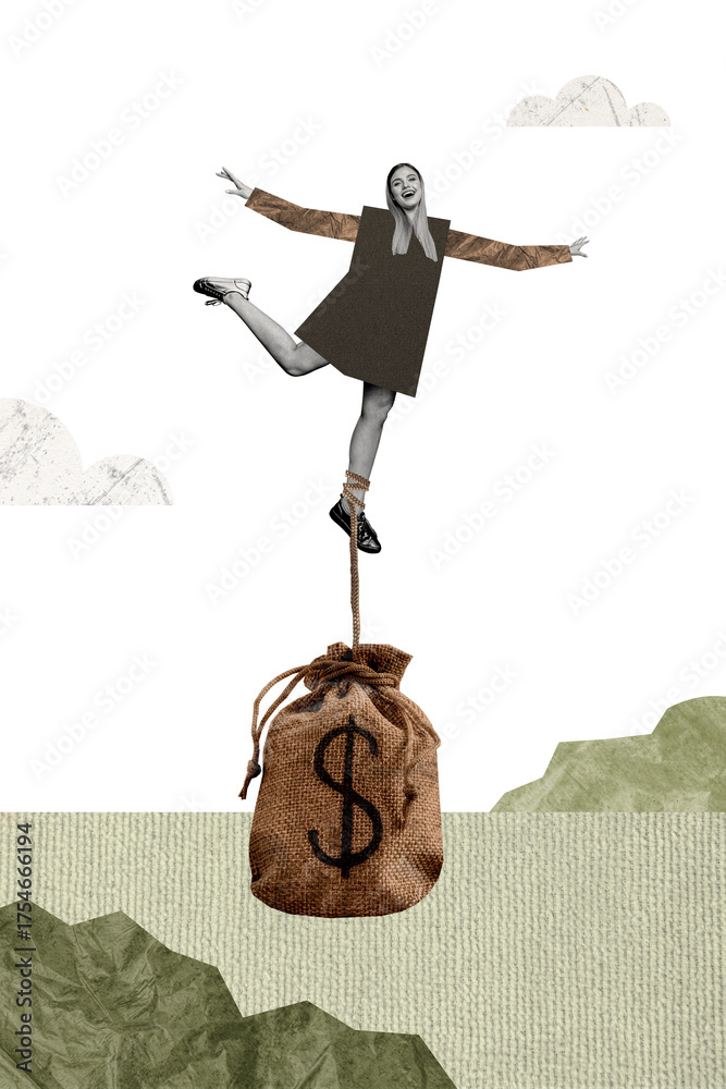 Vertical photo collage of happy blonde fly girl tied rope money dollar bag success business deal outdoors isolated on painted background