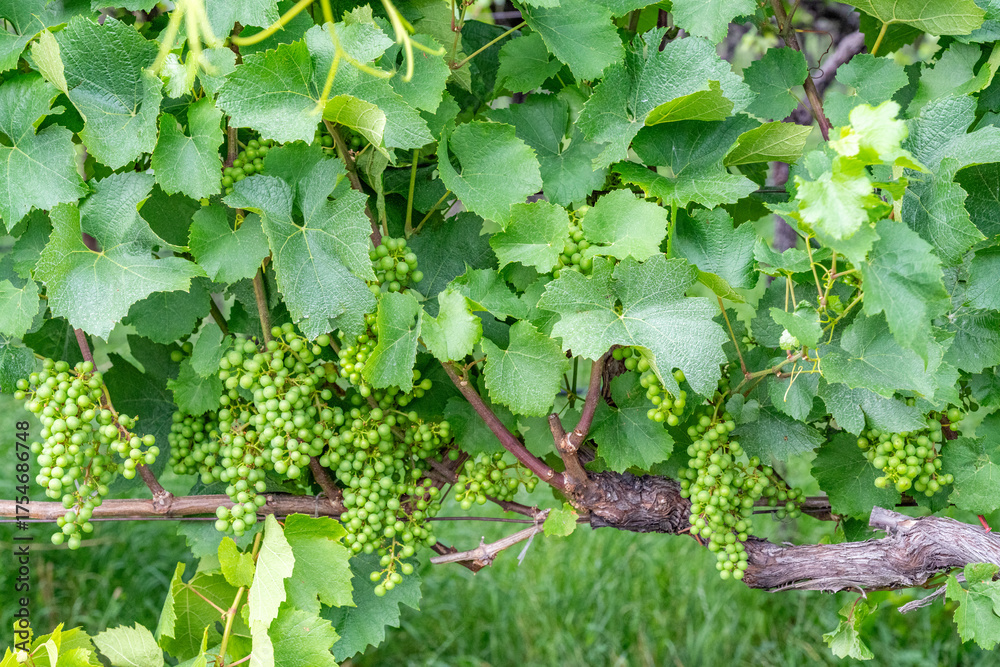 Green grapes growing on a vine in a vineyard, for wine production.
