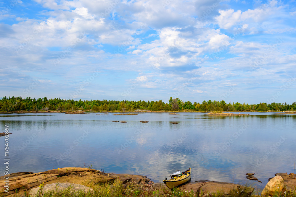 autumn landscape with kayak landed on lake shore and cloud reflection in still water room for text copy space shot on Georgian Bay in fall