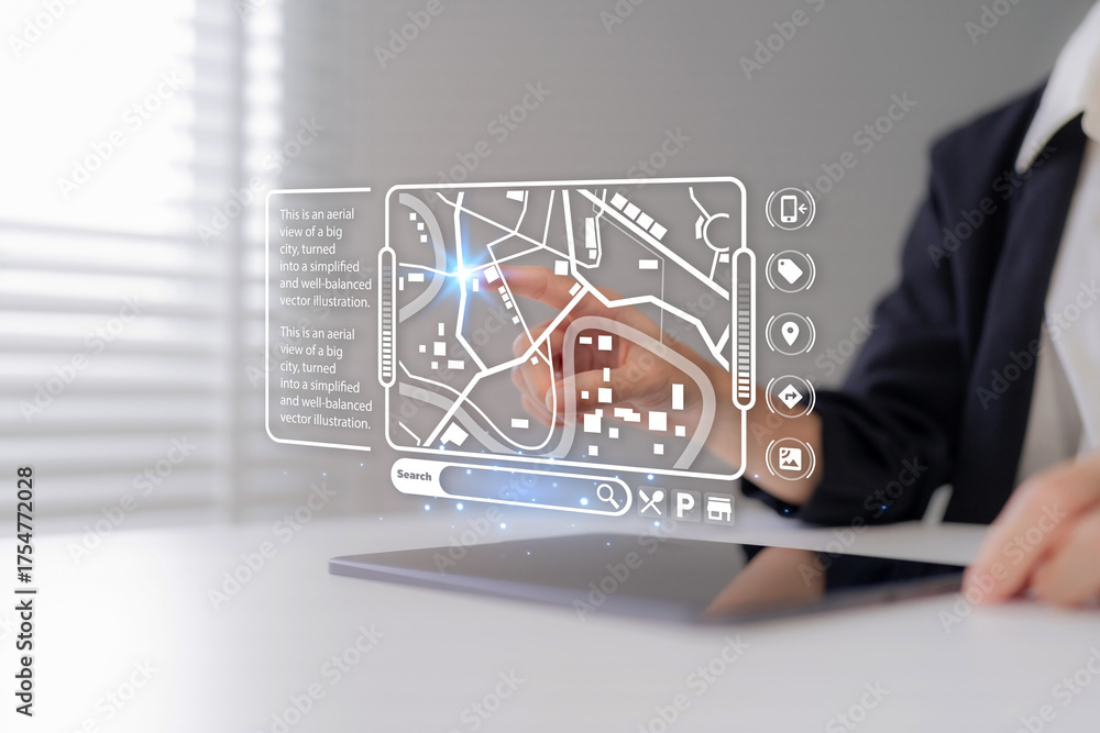 Professional hand uses futuristic interactive digital city map for urban navigation location search planning