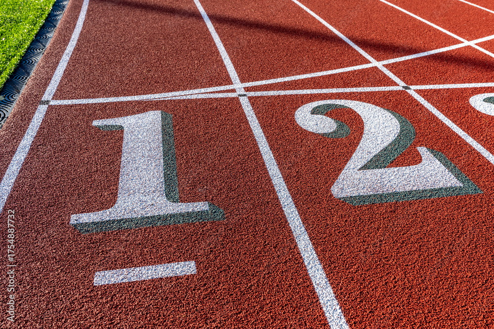 Close up photo of outdoor running track lane white numbers one two, 1, 2, with green shadow on a new red track with white lane lines.