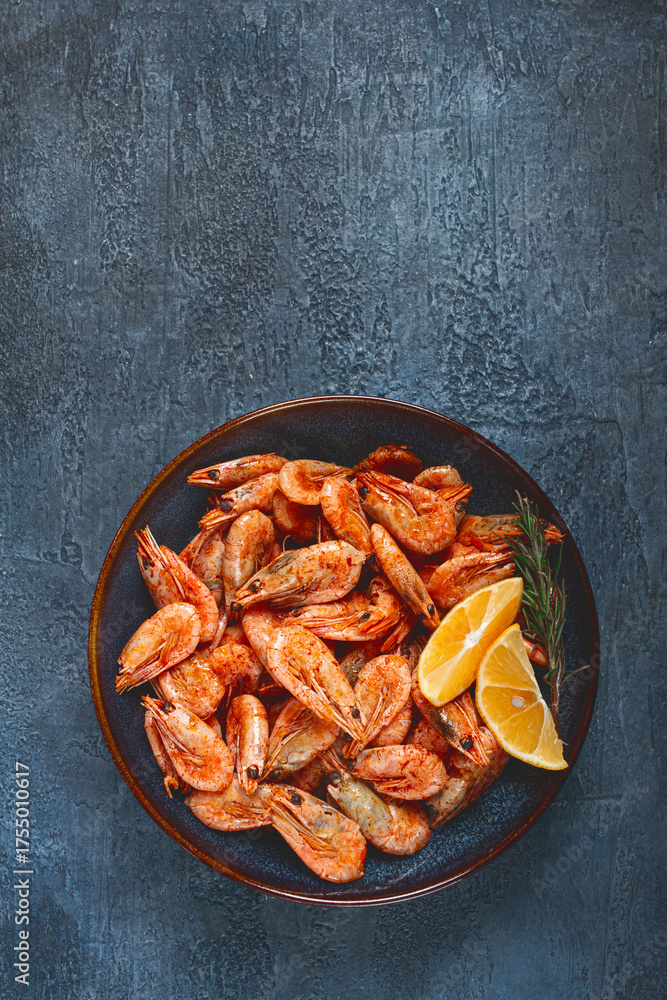 fried shrimp, with shell and head, unpeeled, size 70-90, on a blue background, homemade, no people,