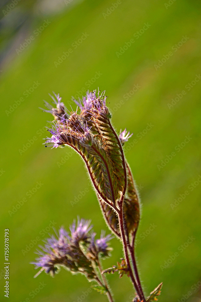kwiatostan facelii, zbliżenie na zwinięty kłos kwiatu facelii na zielonym tle, Phacelia tanacetifolia, blue phacelia, closeup of coiled lacy phacelia flower spike
