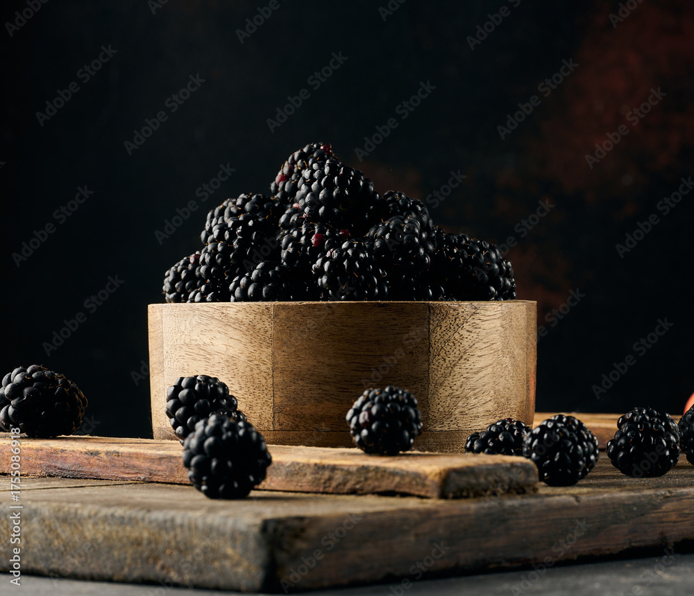 A wooden bowl filled with ripe blackberries on a board. A few berries are scattered around