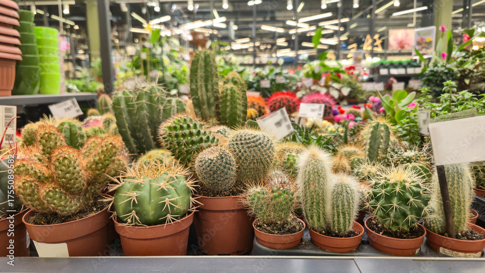 Various species of cacti in small brown pots on display in a garden center. Different shapes and colors of spiny succulents, indoor plants for sale in a greenhouse or plant shop.