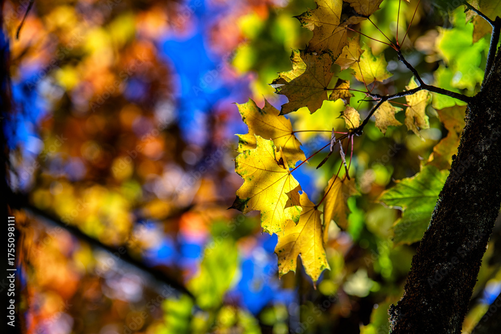Yellow autumn maple leaves with colorful blurred background and blue sky
