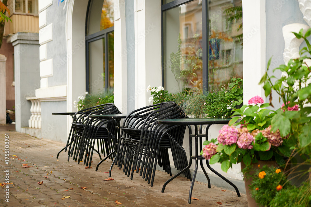 stacked black chairs outside cafe next to large window with vibrant potted plants and flowers. outdoor seating arrangement after hours on cobblestone sidewalk enhances urban charm.