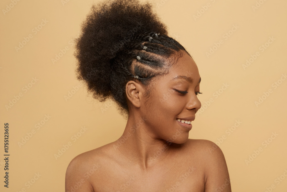 Portrait of a young African American woman with bare shoulders smiling and looking aside on a beige background with copy space. Concept of skincare, natural beauty, body positivity, and self-care