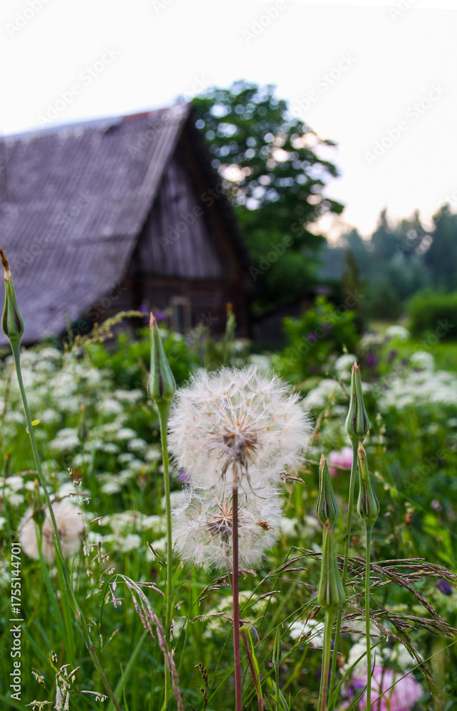 Soft dandelion seed heads glowing in warm sunlight. Purity and the beauty of countryside nature.