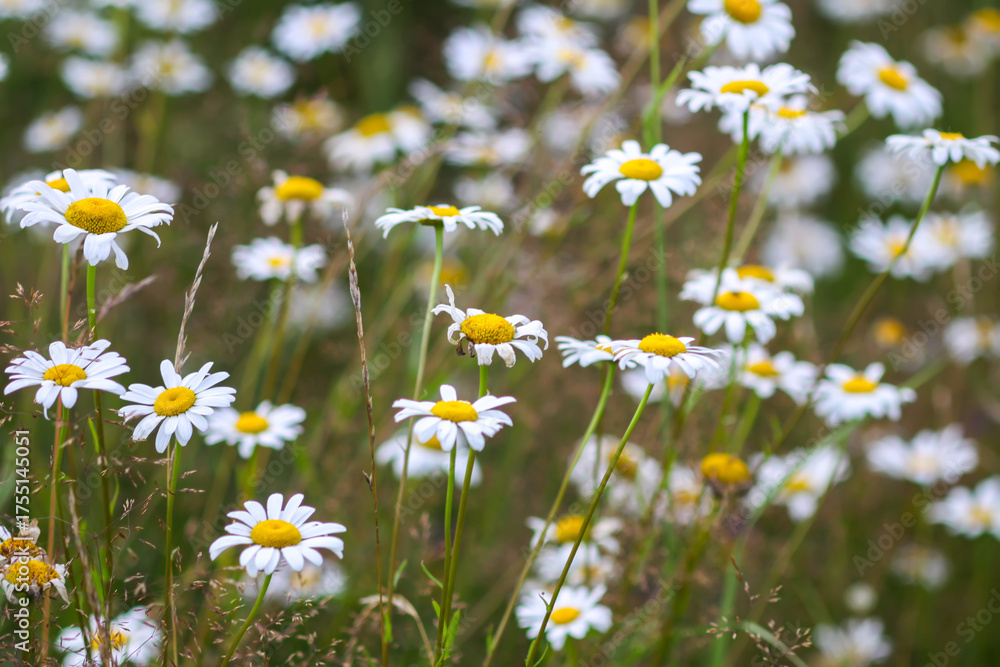 Wild daisy flowers under blue sky background. Purity and rural charm.