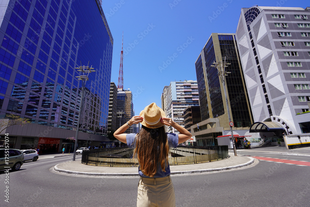 Woman Tourist in Straw Hat Looking Up at Modern Skyscrapers on Avenida Paulista, Sao Paulo, Brazil