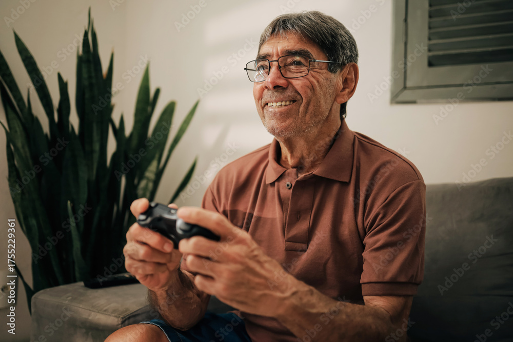 Smiling elderly man enjoying casual console gaming at home, holding wireless controller on couch