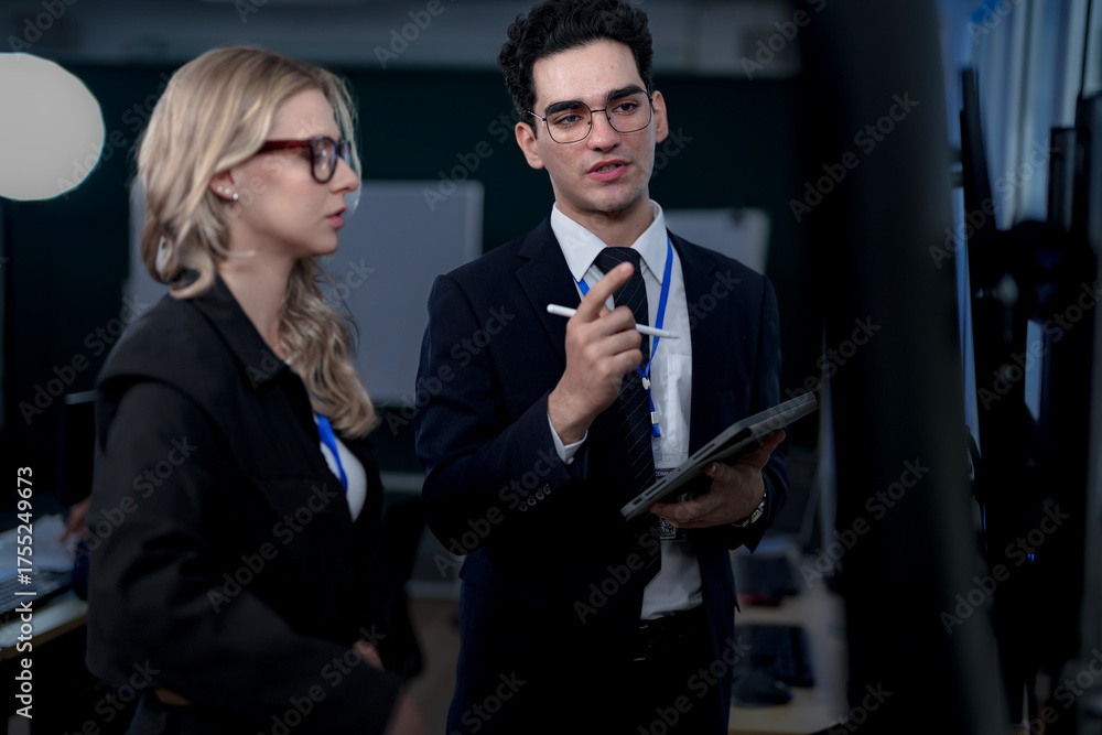 A senior software developer leads a code review session, pointing to a specific function on the screen to explain its logic and syntax to a junior engineer before a major deployment.
