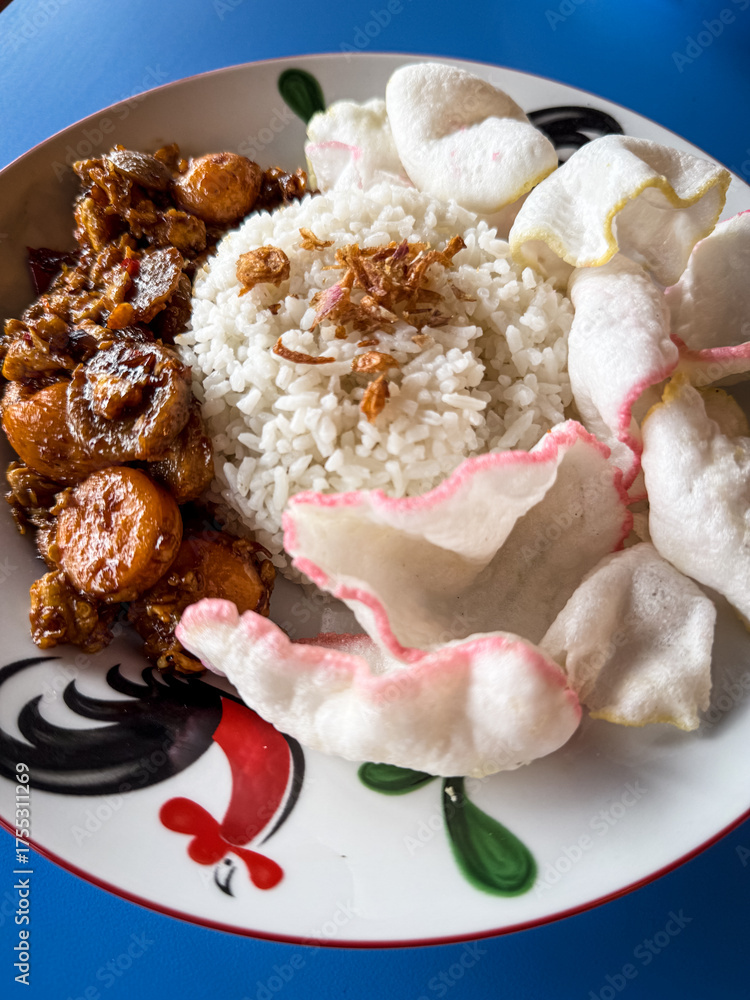 A delicious plate of Indonesian “Nasi Gila” served with white rice, spicy stir-fried toppings, and crispy crackers on a rooster-pattern plate over a blue background.
