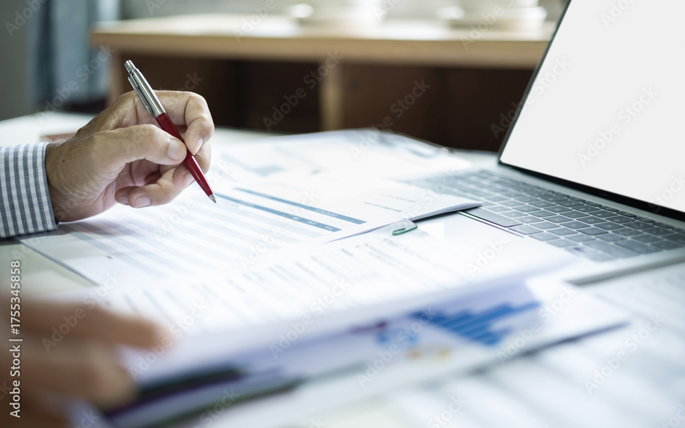 close up shot, asian businessman working on desk with laptop checking documents and business contract