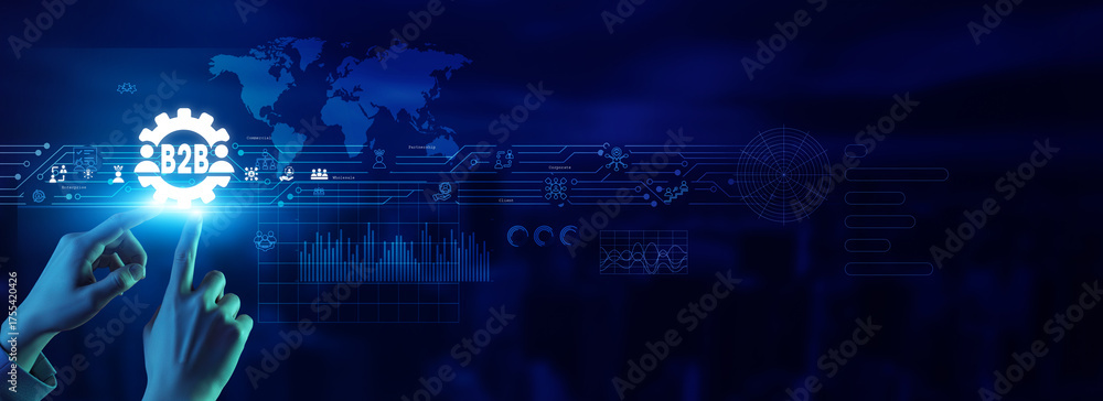 Entrepreneur touching a B2B business icon seeks partnership, collaboration, trade connection, corporate network, growth opportunity, strategic alliance, digital transaction, and development.