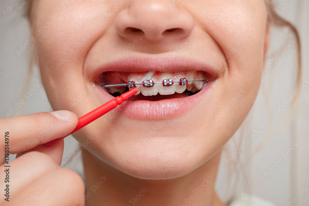 Brace Cleaning for Kids. Little Girl Child Cleaning Teeth Brace By The Brush Close up. Take Care of Braces for Children.