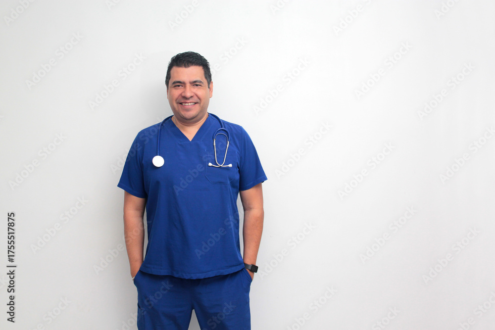Dark-skinned Latino male doctor specialist with a stethoscope shows pride and success in his work for the health of patients